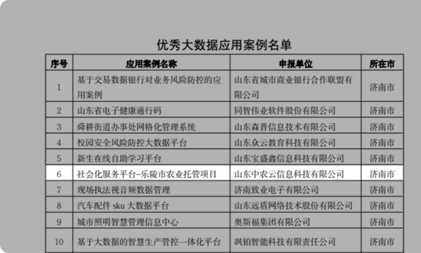 2021年12月,山東省工業和信息化廳關于2021年度省級大數據“三優兩重”項目中,被評為省級優秀大數據應用案例,也是全省唯一一個農業服務大數據項目。