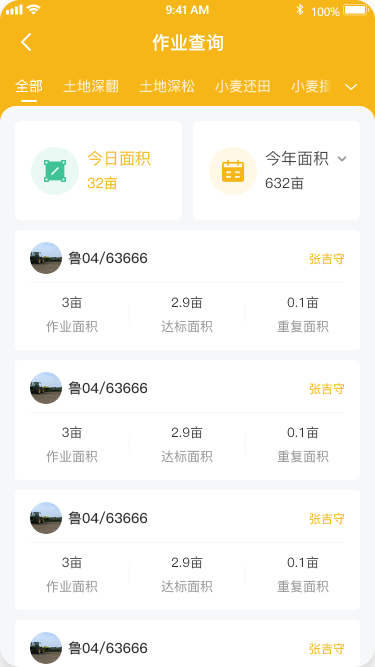 按作業類型、今日面積、年面積以列表形式顯示農機作業詳細信息。